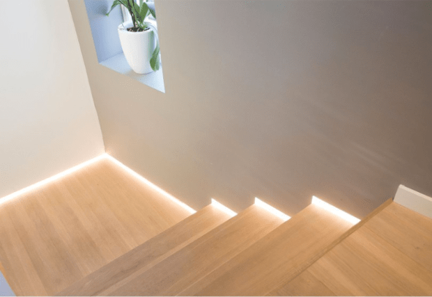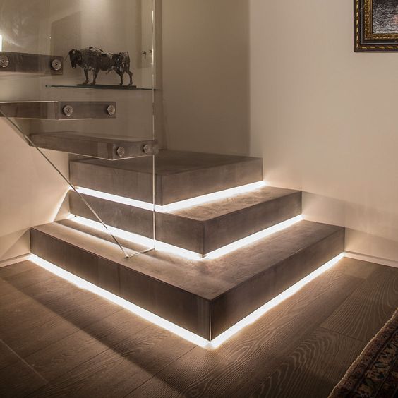 Una delle soluzioni più recenti e più utilizzate dagliarchitetti sono le strisce led incassate nelle intercapedini ai lati del corridoio o della scala, in linea con il battiscopa, oppure nel bordo del gradino. Creano effetti luminosi molto interessanti, mettendo in risalto la finitura del pavimento e delle pareti.
