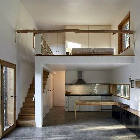 Ogni gradino può essere creato per nascondere o riporre oggetti, in questo ca scala è perfettamente integrata nell’angolo cucina del mini appartamento. Si tratta di una soluzione da studiare su misura.