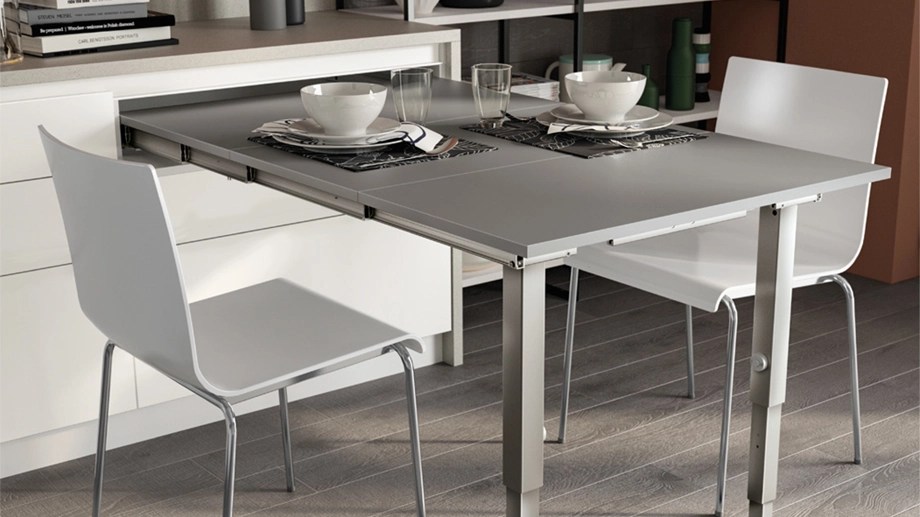 Ideale per tenere in ordine la cucina e per non saturare lo spazio al centro ci una piccola zona giorno. Questa è una delle soluzioni in commercio, si tratta di una cucina componibile della Scavolini in cui il tavolo viene completamente nascosto nella base del mobile.