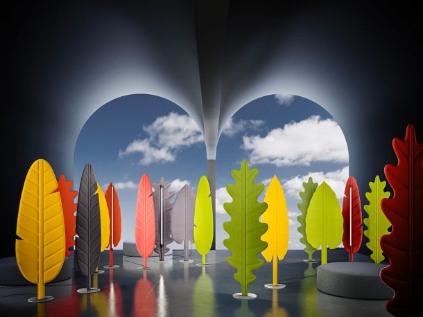 Molto carina e particolare è Eden, la collezione di lampade da terra fonoassorbenti di Rotaliana. Si tratta di una serie costituita da morbide foglie fonoassorbenti, a cui è applicata magneticamente una luce a LED. Il risultato è un bosco fatato, una soluzione di grande impatto e di design, di grande impatto.