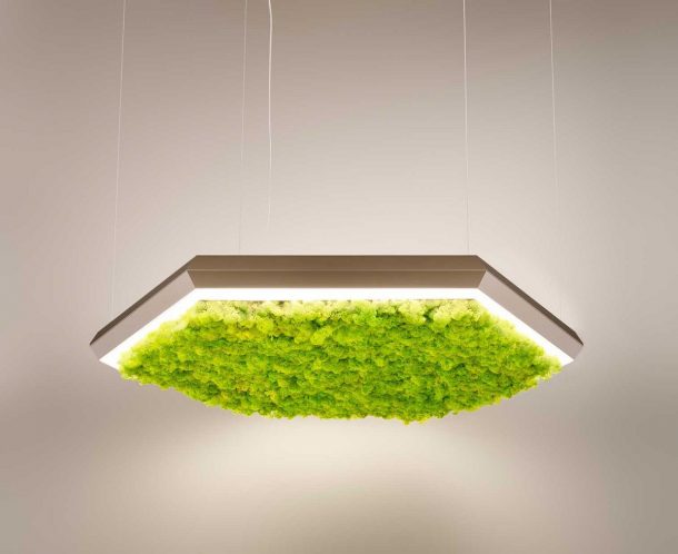 Di Olev è Exagon Silence Green. La lampada green perchè sfrutta le qualità insonorizzanti del lichene naturale. Un materiale fonoassorbente, che possiede però anche altri pregi. Un materiale che si mantiene fresco e morbido nel tempo, non ha bisogno di acqua, è ignifugo, antistatico e non favorisce la riproduzione di insetti. Exagon Silence Green è perfetto per creare installazioni in spazi pubblici scenografiche e di arredo.