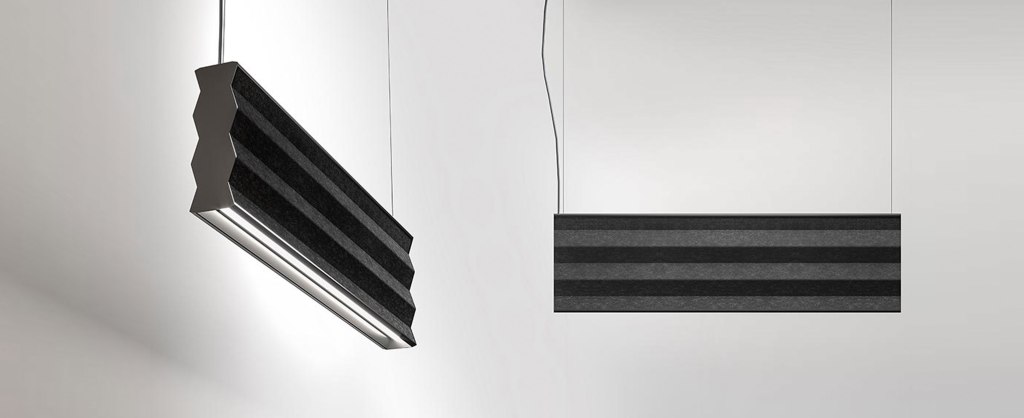 Un altro modello molto interessante è Flexia prodotta da Artemide, disegnata da Mario Cucinella. Si tratta di una sospensione acustica ispirata alla papiroflexia, la tecnica usata per piegare il papiro. La parte fonoassorbente è realizzata con fibre riciclate: il tessuto esterno realizzato con bottigliette di PET, il pannello interno con materiali di scarto. Interessante non solo per le forme ma anche per l’attenzione alla sostenibilità.