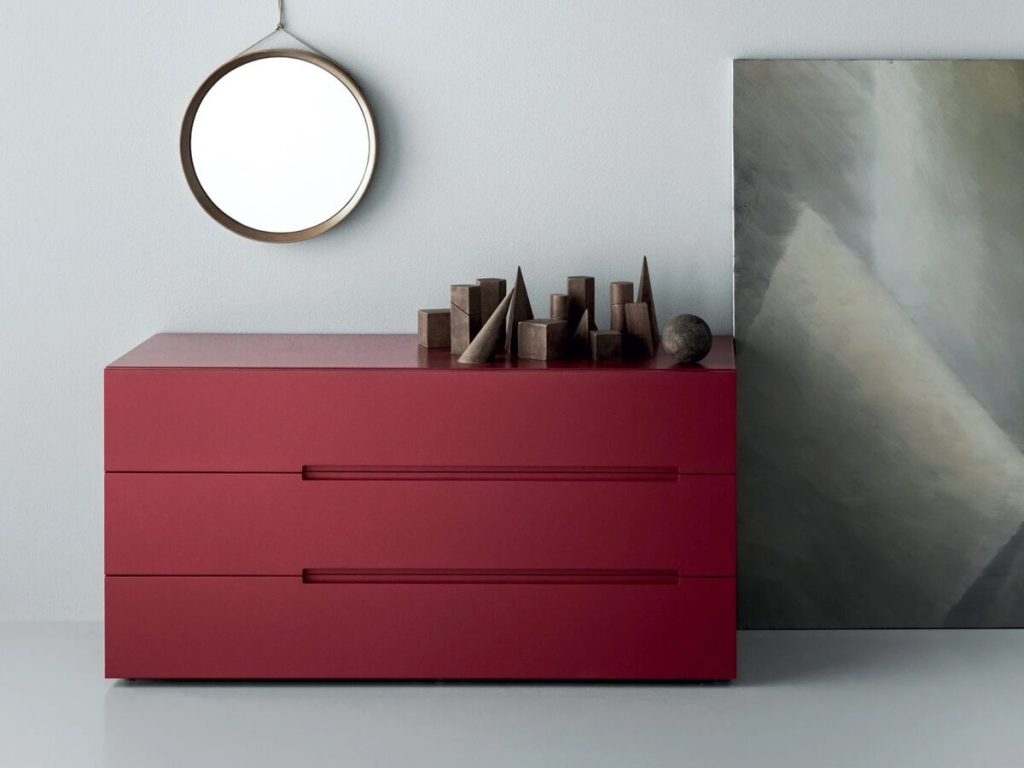 Una cassettiera moderna e dalle linee pulite in cui il colore magenta laccato opaco e le liee pulite ed esseziali si affinacano per dare vita a una mobile adatto a moderne camere da letto. Gli arredi contenitore di Sunset firmati MD House hanno linee e un design molto particolare ed essenziale allo stesso tempo, il loro elemento distintivo, dettaglio molto importante, è la presa a gola orizzontale, non centrata ma asimmetrica, che crea un piccolo disegno che esalta le linee orizzontali dei cassetti.